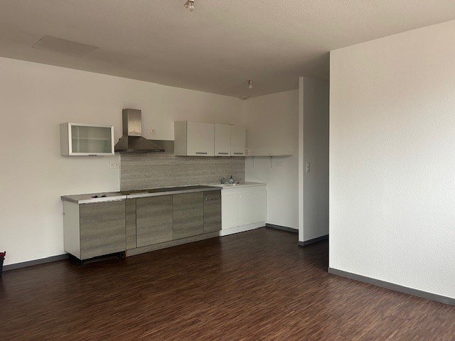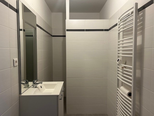 Cuisine ouverte sur séjour, deux chambres, cabinet de toilettes avec douche et WC