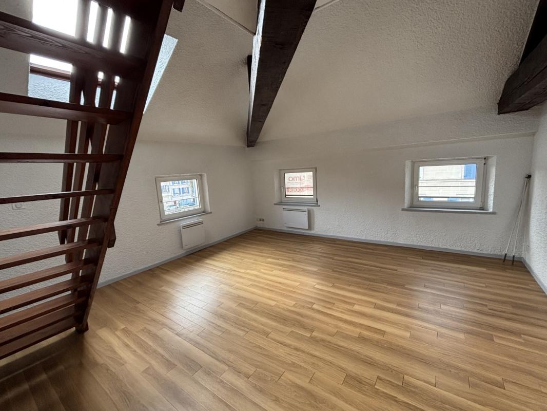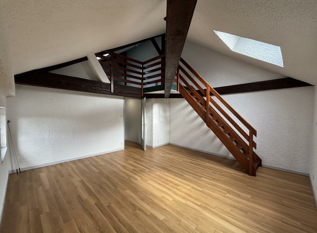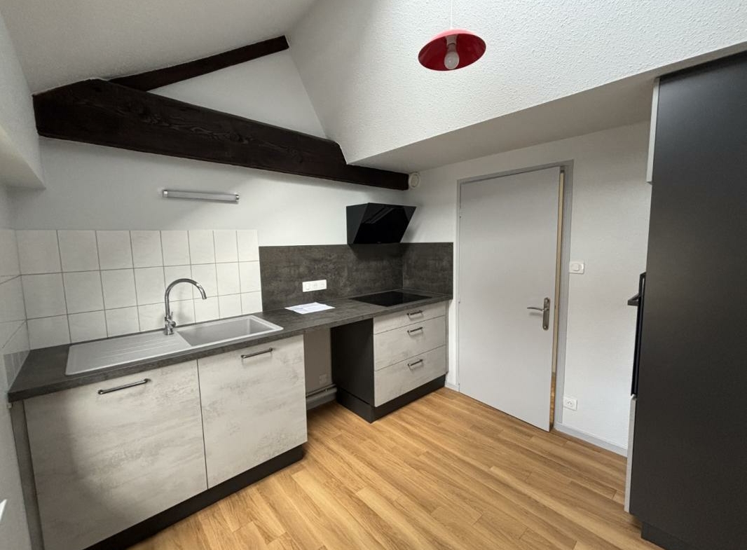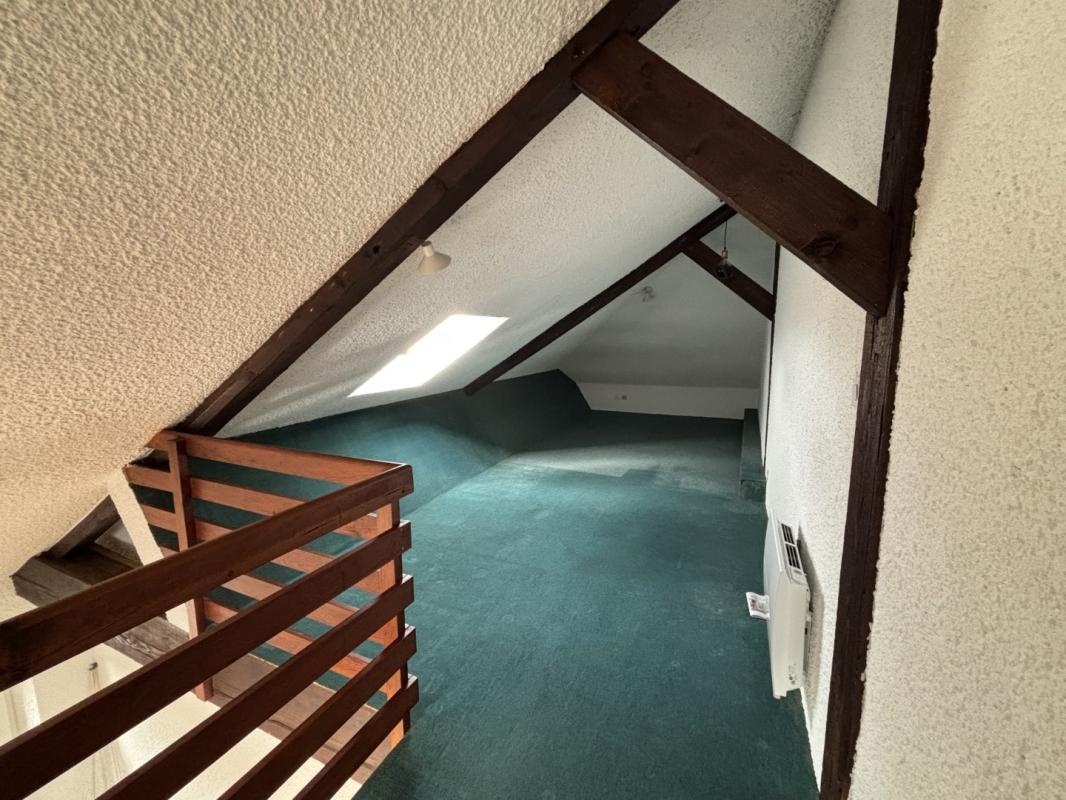 Vous accédez ensuite à une cuisine séparée, entièrement aménagée et équipée (four, plaques, hotte) avec de nombreux rangements. Dans le prolongement, vous découvrirez un beau séjour lumineux avec parquet et poutres apparentes, surplombé par une vaste mezzanine idéale pour un bureau ou un second couchage.