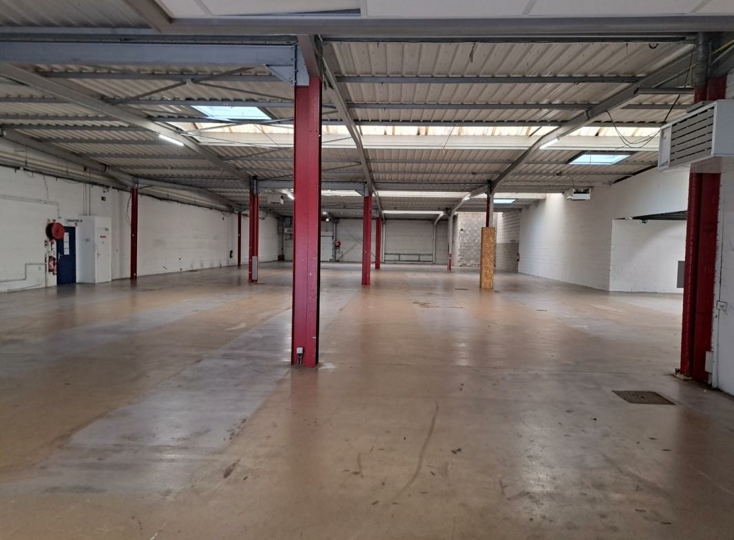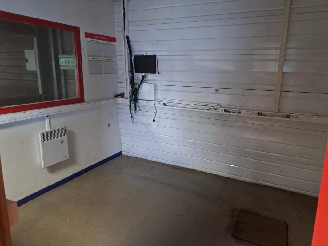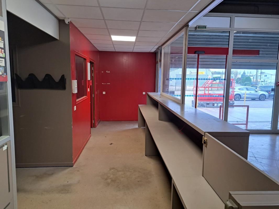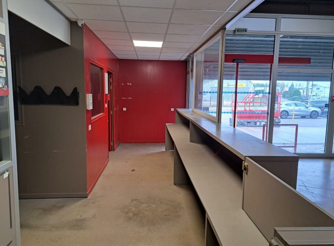 Local commercial avec grand espace de vente, vitrine, bureaux, et annexe pour stockage, coin sanitaire.
